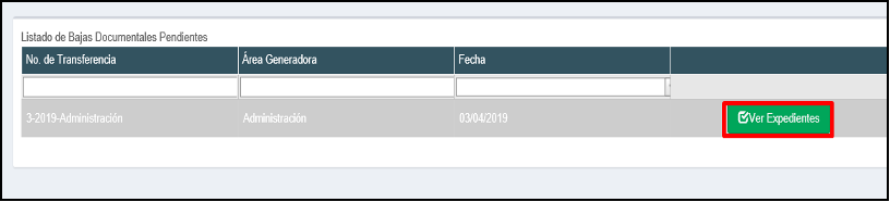 Al seleccionar Transferencia Secundaria, nos mostrara la pantalla donde no enlistan los expedientes candidatos para la transferencia. Seleccionaremos el icono del expediente a ver.