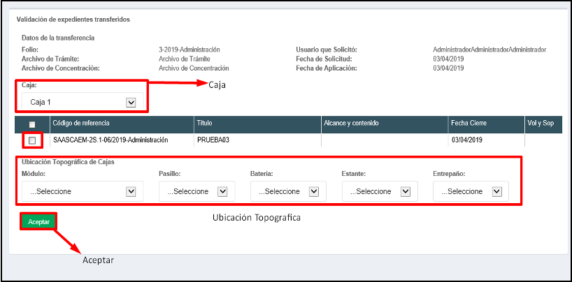 Dentro de la Validación de los expedientes transferidos, es necesario seleccionar la caja en la que estos fueron transferidos, y asignar la ubicación topográfica de la o las cajas.