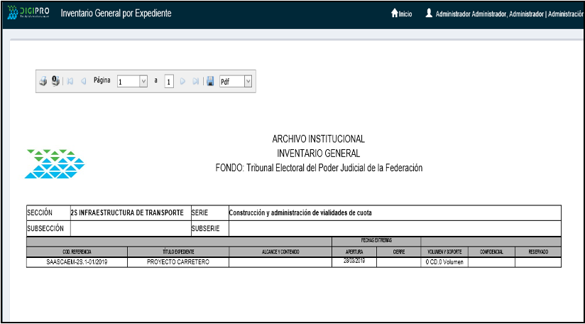 Enseguida nos mostrara nuevamente el Inventario de Transferencia Primaria y podremos imprimir la o las etiquetas de la o las cajas para identificarlas.