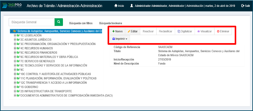 Nuevo –            Esta función nos permite crear cualquier nivel del cuadro archivístico a partir