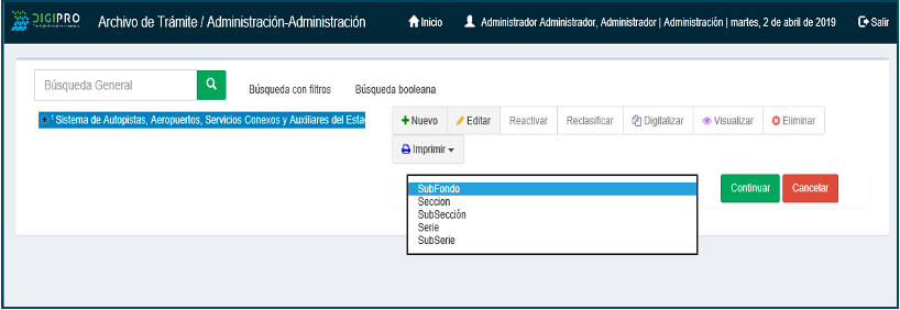 Imprimir-          Esta funcionalidad nos permite imprimir de cada uno de los niveles del cuadro archivístico, las siguientes opciones: