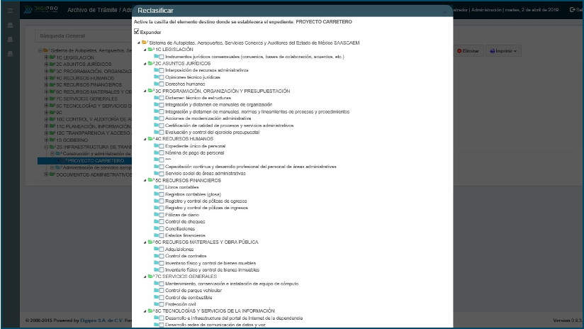Al reclasificar nos mostrara la ventana donde nos solicitara seleccionar la ubicación en donde se requiere reubicar el expediente. Por lo que nos mostrara ya desglosado todo el cuadro archivístico.