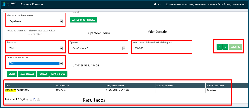 Al utilizar una búsqueda general solamente se tiene que capturar el titulo o parte del título del registro a buscar, y nos mostrara los registros que contengan el criterio buscado. Enseguida dar clic en el icono verde para ejecutar la búsqueda.