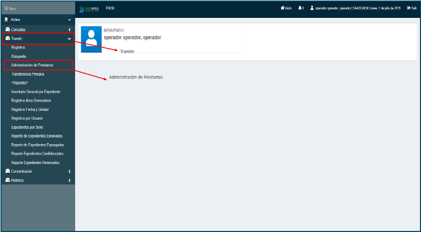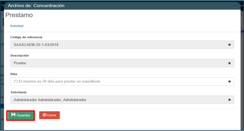 Esta herramienta nos permite solicitar en préstamo alguno de los Expedientes y/o Documentos.