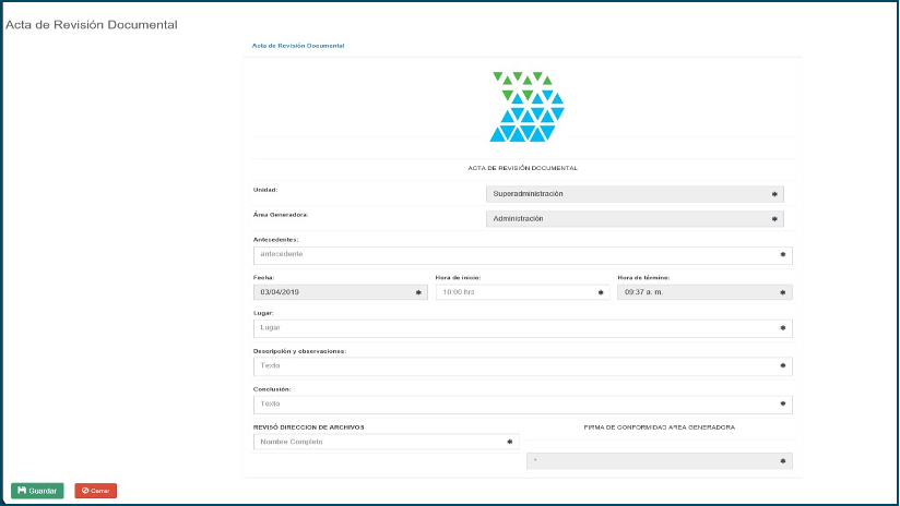 De la misma manera procederemos a generar el Acta de Revisión Documental, tal y como se realiza en el procedimiento de la Transferencia Primaria en Archivo de Tramite.