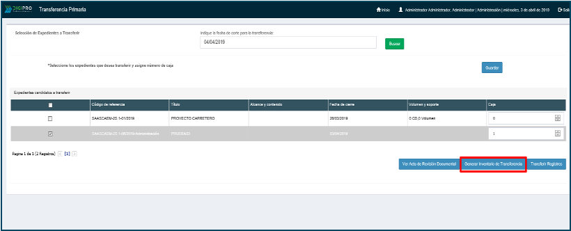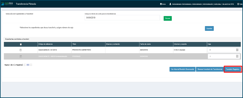 Al validar la transferencia tendremos que indicar el numero de la caja en donde se almacenaron los expedientes.