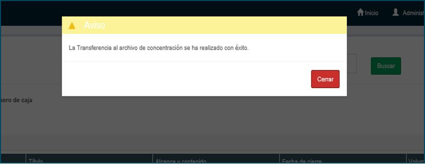 Nos mostrara el siguiente mensaje en el cual nos confirma que la transferencia al archivo de Concentración se ha realizado con éxito.