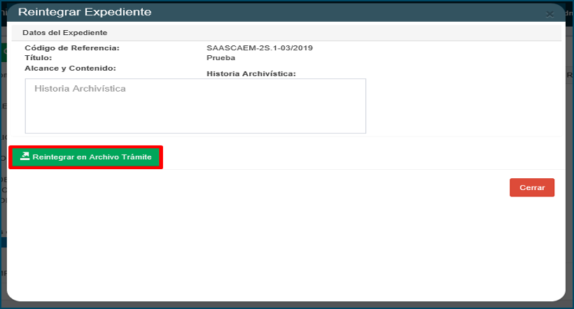 Al elegir esta funcionalidad es importante indicar que solamente se puede reintegrar un expediente cuando este se encuentra en Archivo de Concentración, por lo que este al ser reintegrado, se regresará a Archivo de Tramite, para continuar con algún proceso y/o alguna modificación en este.