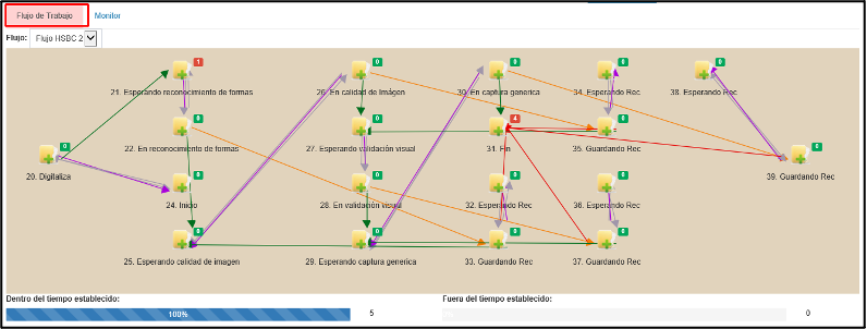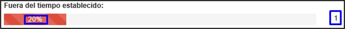 Dentro de la pestaña flujo de trabajo, en la parte inferior derecha veremos una barra color rojo, la cual indica el porcentaje y los expedientes que se encuentran “Fuera del tiempo establecido”.