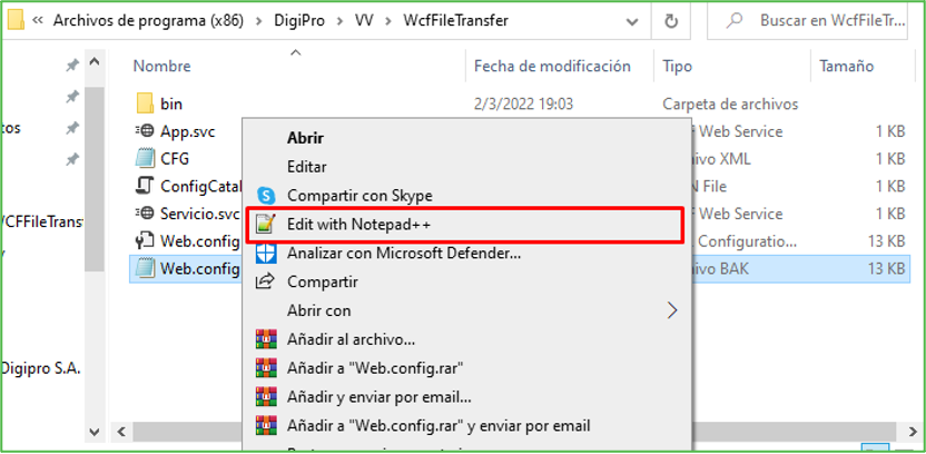 Para realizar los cambios y configuración se accede a la carpeta de la aplicación, en este caso WcfFileTransfer.