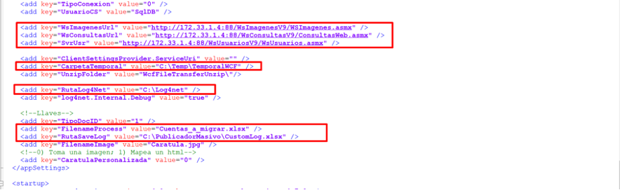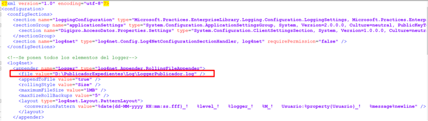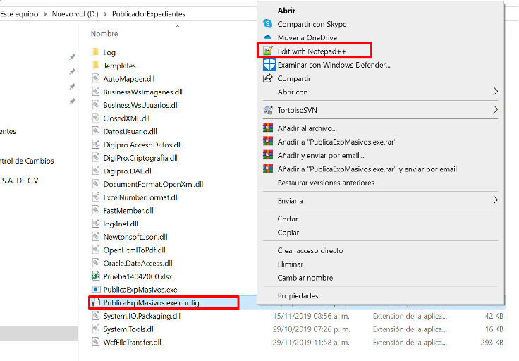 Ir a la ruta donde se encuentra la carpeta de la aplicación del Publicador de Expedientes. Abrir el archivo PublicaExpMasivos.exe.config con algún editor.