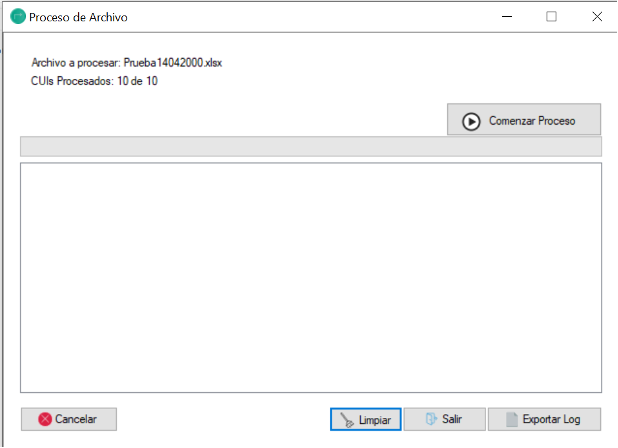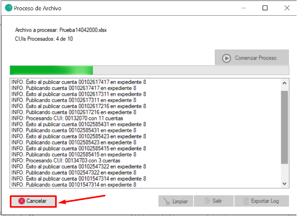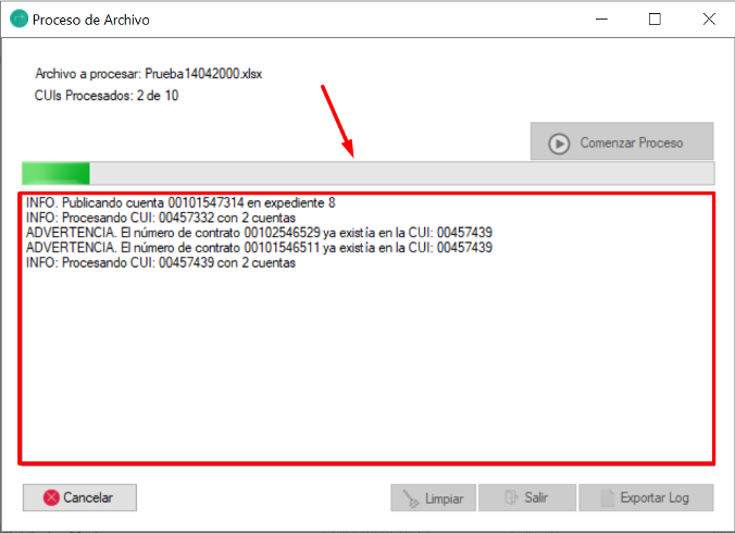 Nota: La aplicación comenzará a mostrar la Barra de Proceso y el detalle de los expedientes que vienen en el Excel agrupados por CUI, se debe esperar a que finalice el proceso