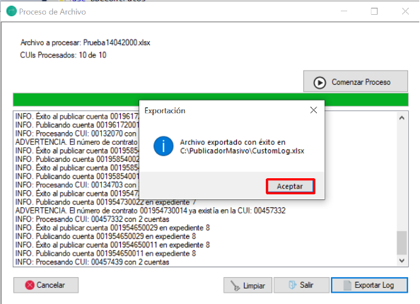 Una vez finalizada la carga, se puede exportar el archivo Log con el detalle del proceso. Dar clic en Exportar Log