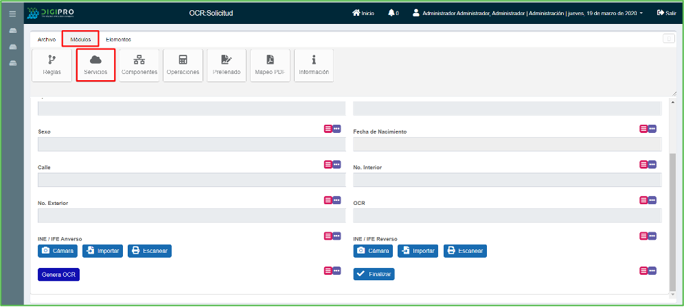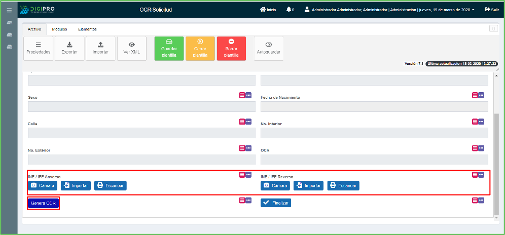NOTA: Los elemento imagen servirán para escanear, importar o bien tomar foto de la INE o IFE para realizar el proceso OCR y tomar la información y el botón es quien ejecutará el servicio.