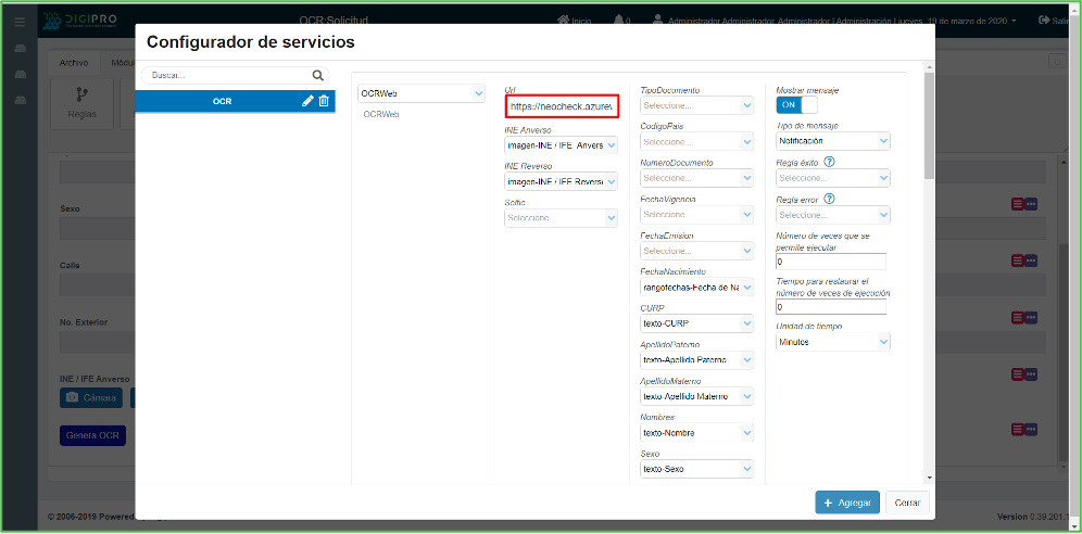 Dar clic en el nuevo servicio creado para realizar la configuración y seleccionamos “OCRWeb”.