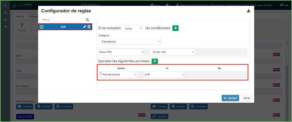 Después se estarían seleccionando los campos que se van a prellenar con el servicio OCR y después clic en botón “Cerrar”.