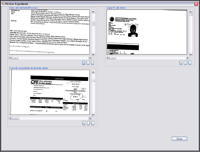 Revisar Expediente – Este botón permite visualizar el total de documentos en el expediente, en esta ventana se muestran las mismas partes de la subsección de captura con la diferencia que no se muestran campos de captura.