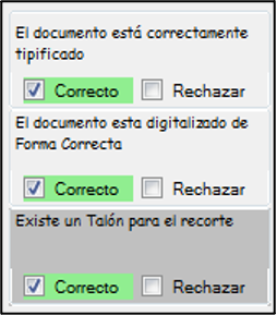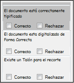 Esta sección se actualizará dependiendo del tipo de documento que se esté revisando. Para marcar correcto o rechazar un campo se puede hacer dando clic en el cuadro de selección, solamente se mostrarán habilitados los campos para validar los campos configurados.